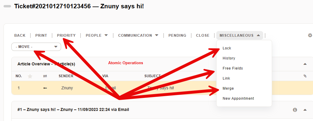 Atomic Operations: By default, Znuny implements an atomic operation approach, offering you multiple screens to perform individual operations. These screens ensure that specific operations are performed atomically, without interruption, reducing the chances of interference.