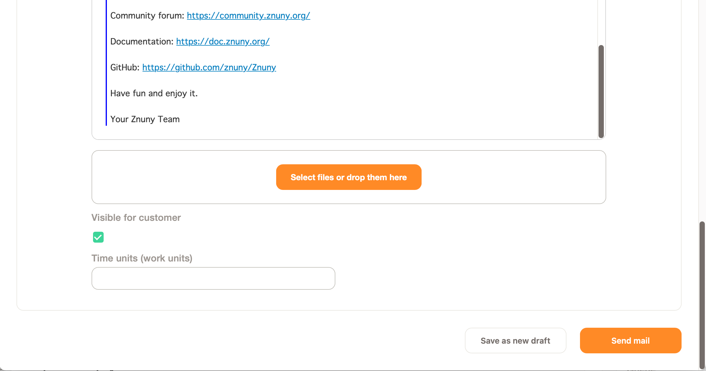 Znuny offers the draft feature to ensure that you can save your work at any time and in different variants to ensure that when you're ready to communicate, you can do this in the best possible way. Each time you open a communication window, whether a reply or a new E-Mail, you can save a draft.