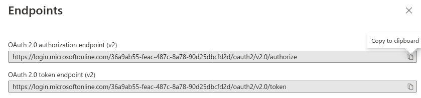 Enter the URL for authorization code, URL for token by authorization code and URL for token by refresh token. You find it if you click in the Azure portal, in the main screen of your app, on Endpoints.