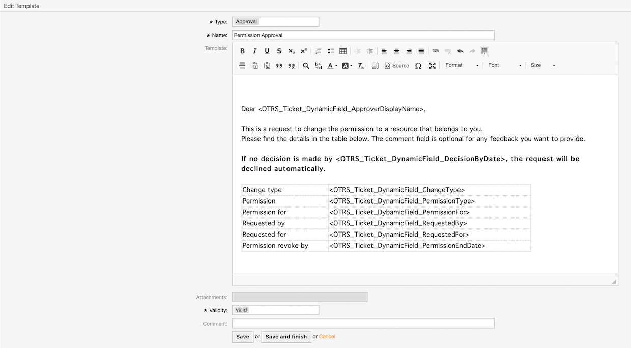 The next step is to create a standard template to display all details of the request to the person approving it. The name is used in the parameter of the Transition Action.