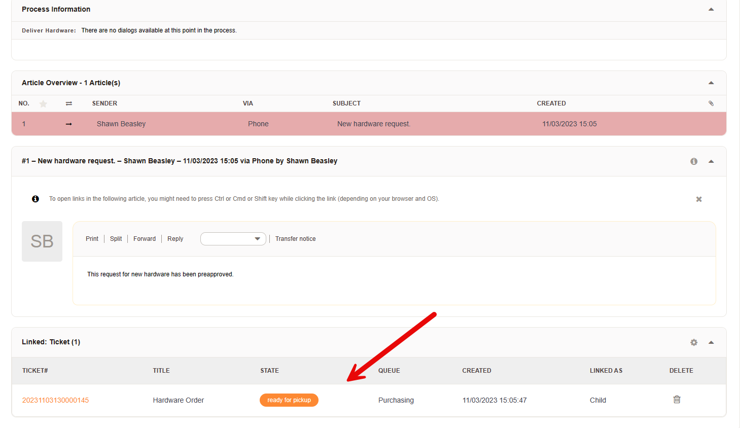 The hardware replacement ticket is updated as soon as the hardware is registered as delivered and available. The hardware replacement can now be scheduled, and the agent will finally receive their shiny new laptop.